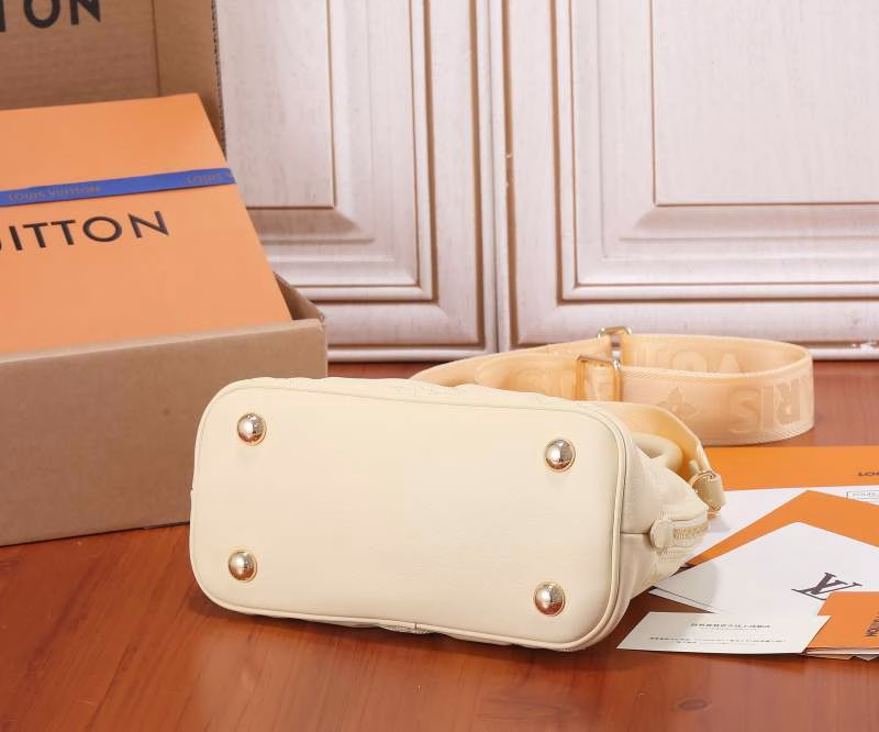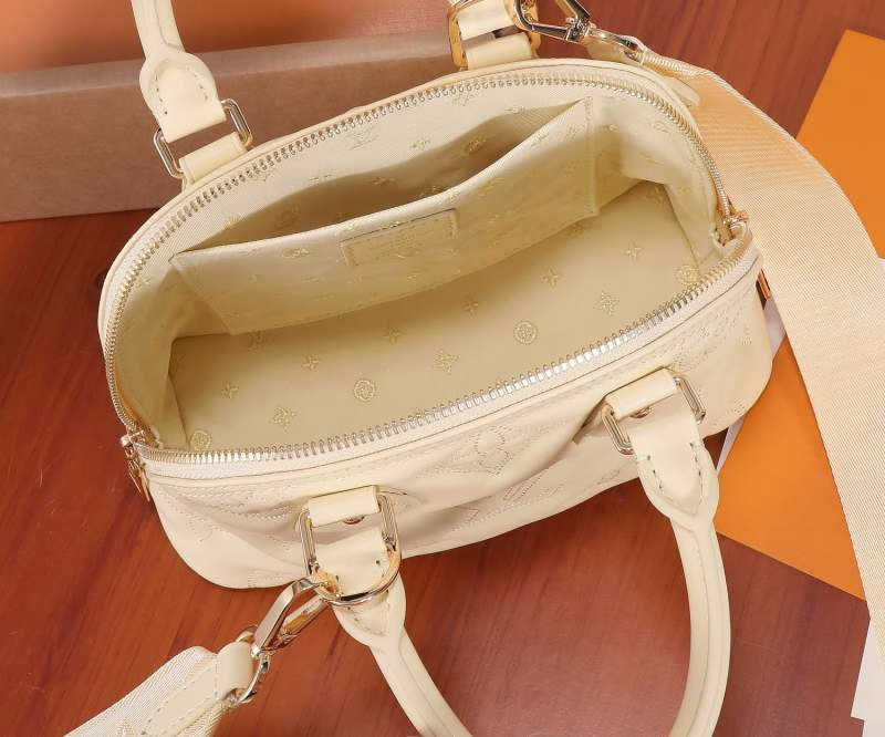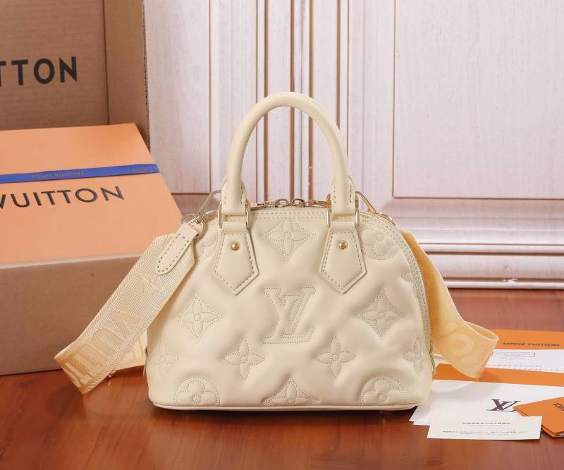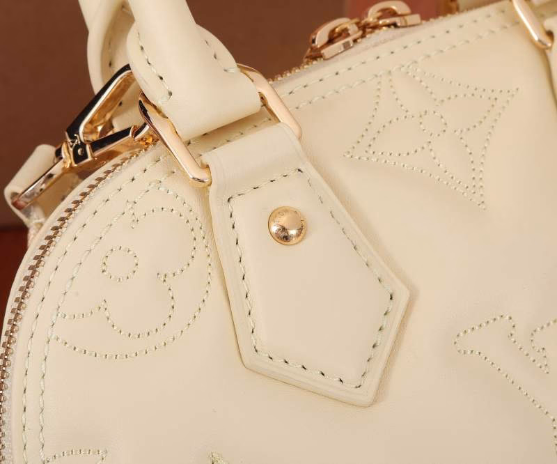 This Alma BB handbag embodies the essence of 1930s Art Deco style. Its rounded, voluminous silhouette is crafted from quilted cowhide leather, adorned with embroidered Monogram patterns. It comes with a rolled leather handle and a detachable, adjustable shoulder strap, enabling effortless switching between handheld and crossbody carrying styles.