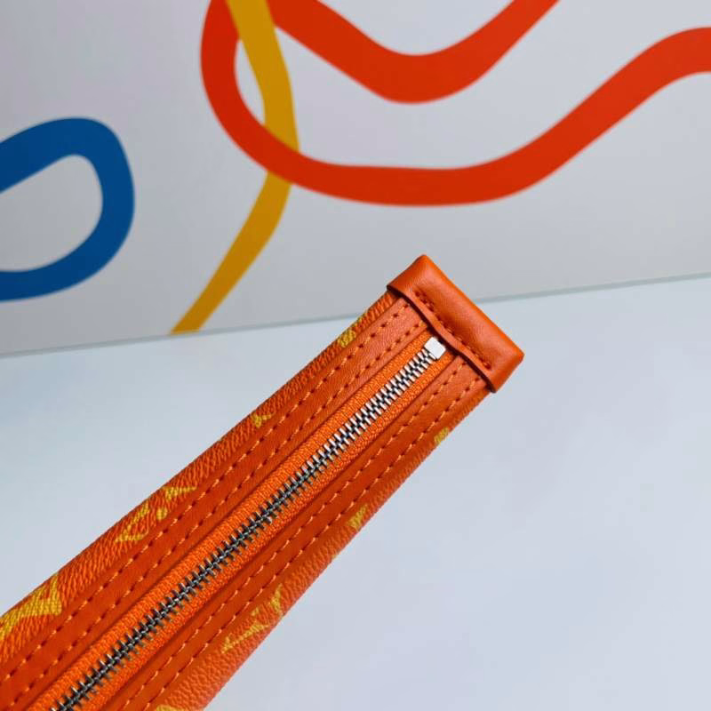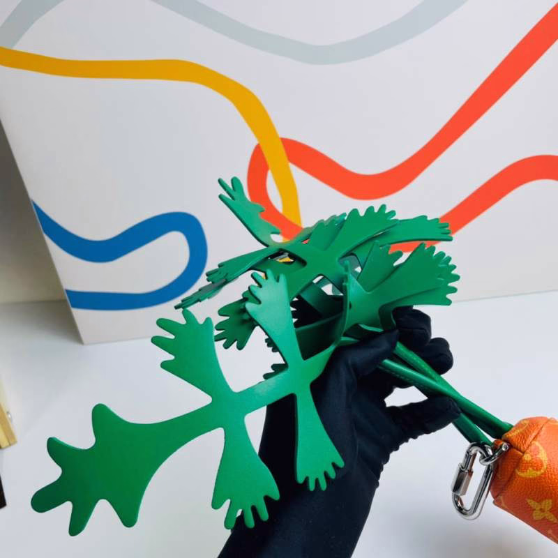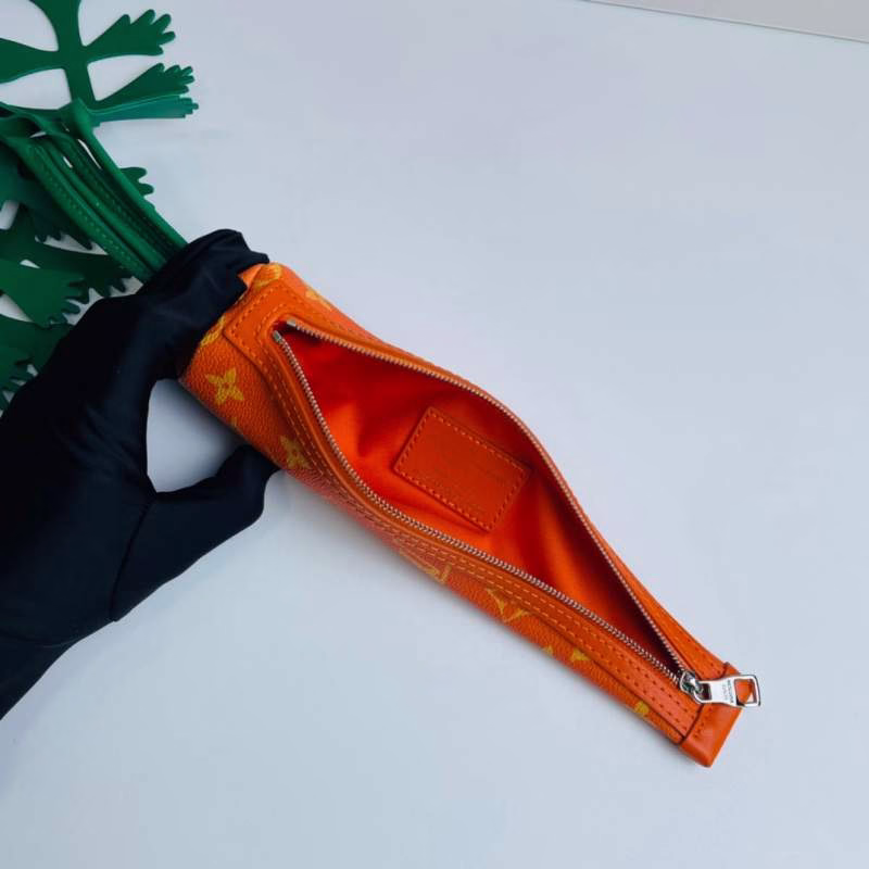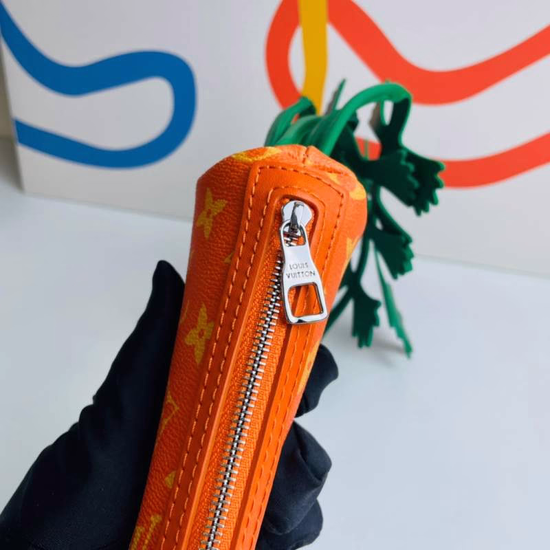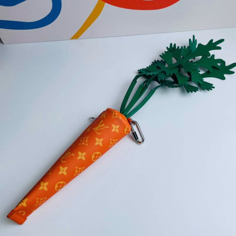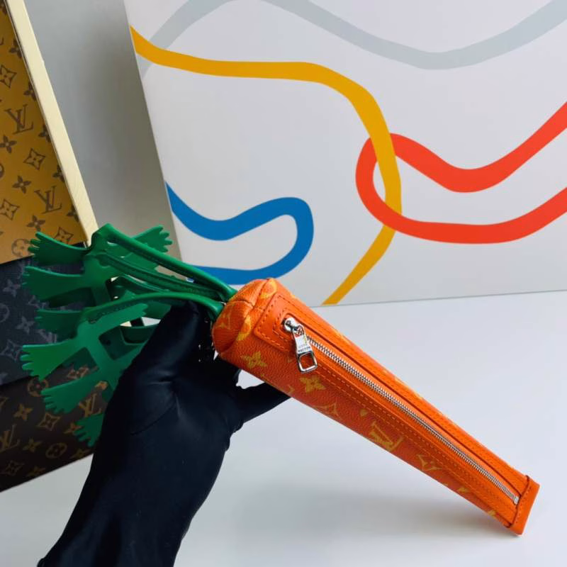 LV Louis Vuitton’s Virgil Abloh presents the Carrot clutch for the 2021-22 Fall/Winter runway show. Crafted from Monogram canvas in a compact carrot shape, it is paired with leather “leaves” and can be attached to other handbags via a spring clasp, exuding playful charm.